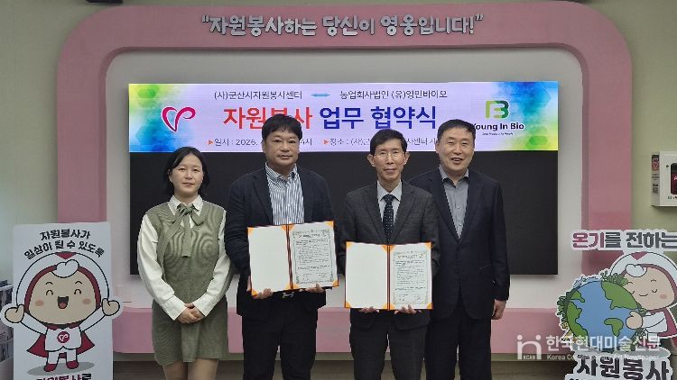 한국현대미술신문 기자 | (사)군산시자원봉사센터(이사장 황진)와 농업회사법인 (유)영인바이오(대표 최인정)는 4월 20일 오후 2시, 군산시자원봉사센터 세미나실에서 자원봉사 활성화를 위한 업무협약(MOU)을 체결했다.