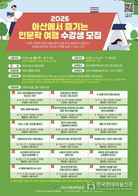 한국현대미술신문 신정은 기자 | 아산시는 시민들이 다채로운 인문학적 경험을 통해 삶의 궤적을 성찰하고, 세상을 해석하는 통찰력을 기를 수 있도록 돕는 '2026 아산에서 즐기는 인문학 여행' 수강생을 모집한다.