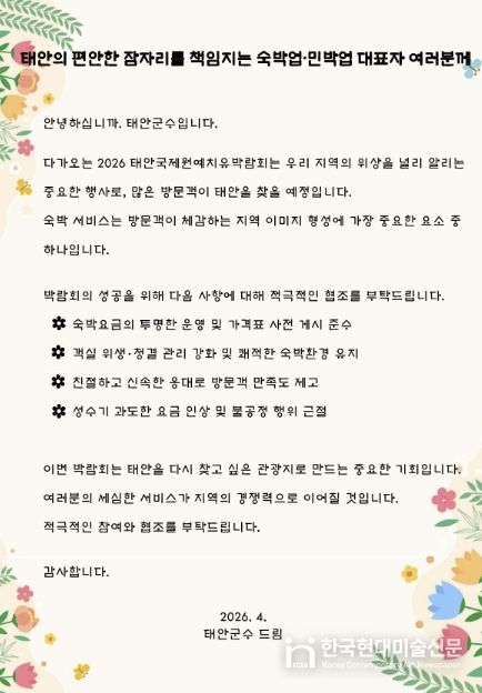 한국현대미술신문 신정은 기자 | 태안군이 ‘2026 태안국제원예치유박람회’ 성공을 위해 숙박·민박·외식업 종사자와 지역 리더 등 4천여 명에게 서한문을 발송했다.