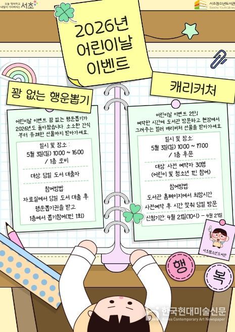 한국현대미술신문 배건 기자 | 서울 서초구는 다가오는 어린이날을 맞아 다음달 3일 서초청소년도서관에서 어린이와 가족 모두가 즐길 수 있는 특별한 문화 행사를 개최한다. 이용자들을 위한 이벤트를 중심으로 일상 속 친숙한 도서관 만들기의 일환이다.