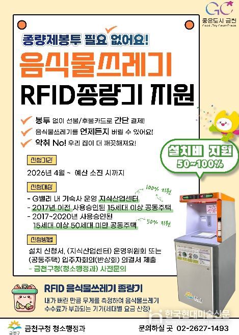 한국현대미술신문 배건 기자 | 금천구는 생활폐기물 직매립이 금지됨에 따라 음식물쓰레기 혼합배출을 예방하고 배출량을 줄이기 위해 2026년 음식물쓰레기 자동계량장비(RFID) 종량기 설치 지원을 신청받는다고 밝혔다.