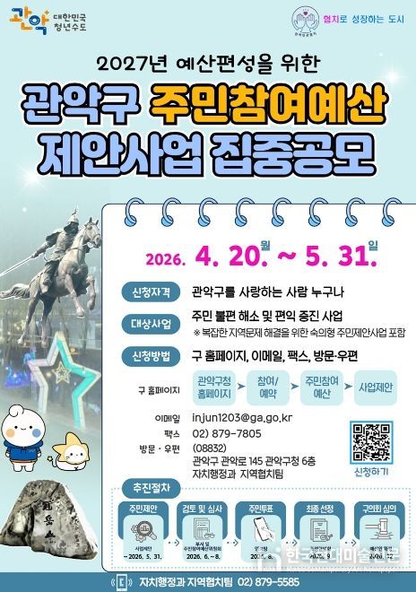 한국현대미술신문 배건 기자 | 관악구가 지역사회 문제를 해소하고 주민 편익을 증진하기 위해 ‘2026년도 주민참여예산사업 및 협치의제’ 공모를 실시한다.