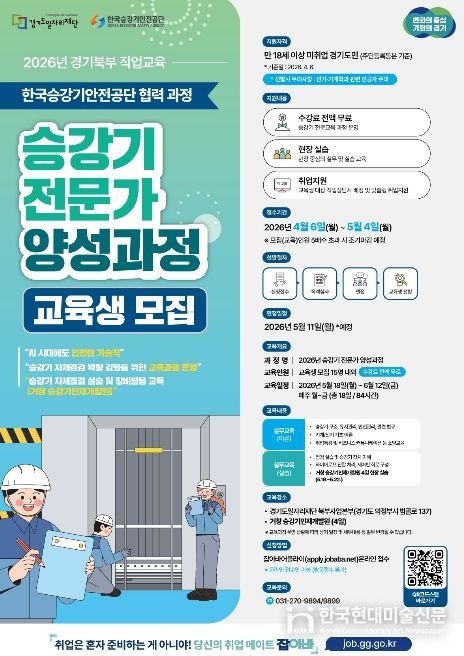한국현대미술신문 배윤섭 기자 | 경기도일자리재단은 승강기 전문 인력 양성을 통해 일자리 문제 해결과 지역경제 활성화를 추진하고자 ‘2026년 승강기 전문가 양성 과정’ 교육생을 모집한다고 21일 밝혔다.