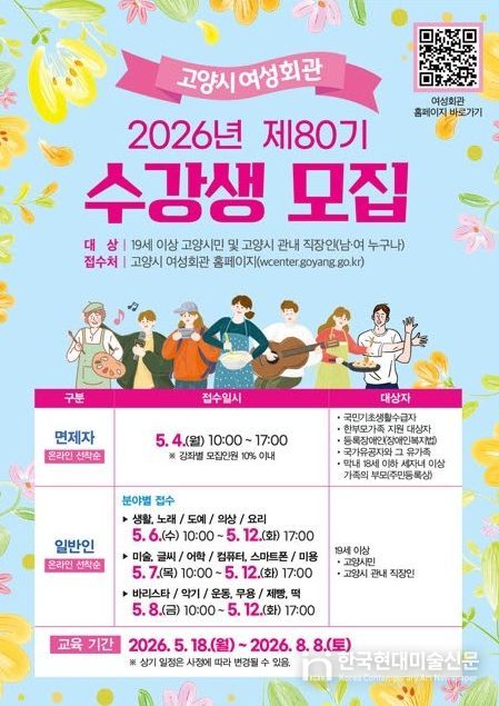 한국현대미술신문 배윤섭 기자 | 고양특례시 여성회관은 오는 5월 4일부터 12일까지 2026년 제80기 정규강좌 수강생을 모집한다.