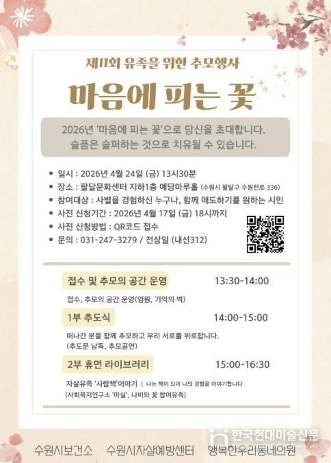 한국현대미술신문 배윤섭 기자 | 수원시자살예방센터가 24일 오후 1시 30분 팔달문화센터 예당마루홀에서 유족을 위한 추모행사 ‘제11회 마음에 피는 꽃’을 연다.