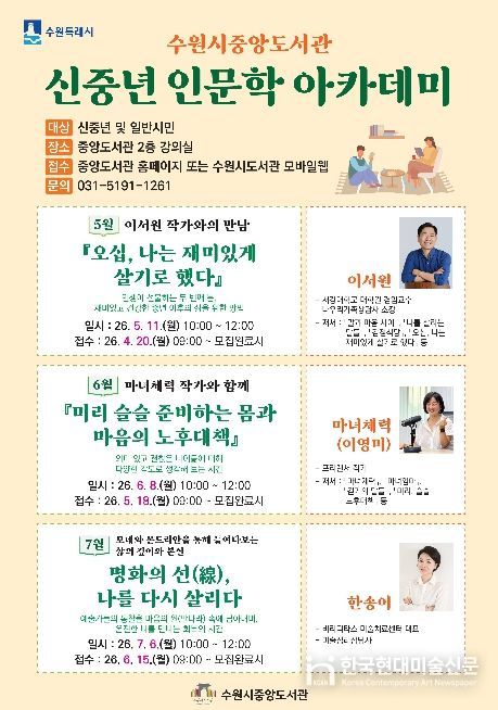 한국현대미술신문 배윤섭 기자 | 수원시 중앙도서관이 5월부터 7월까지 매달 1회 운영하는 ‘신중년 인문학 아카데미’ 수강생을 모집한다.