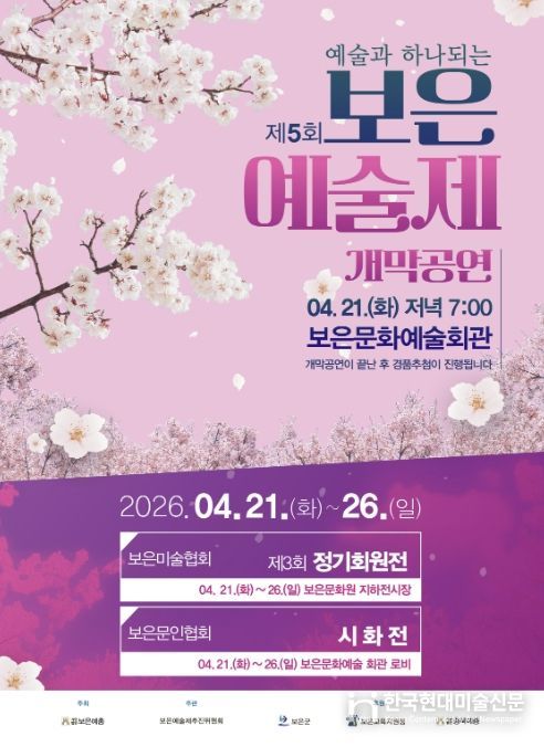 한국현대미술신문 신정은 기자 | 충북 보은군은 지역 예술인과 군민이 문화로 소통하고 화합하는 ‘제5회 보은예술제’를 21일부터 26일까지 6일간 보은문화예술회관 및 보은문화원 일원에서 개최한다고 밝혔다.