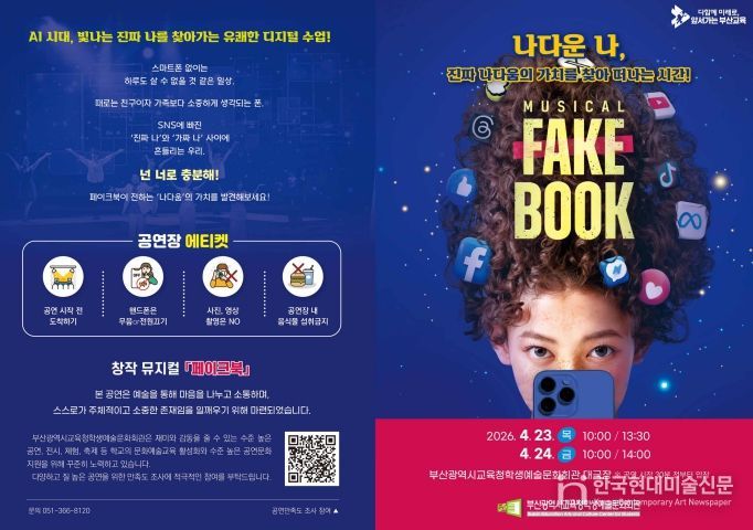 한국현대미술신문 정소영 기자 | 부산광역시교육청학생예술문화회관은 오는 23일과 24일 회관 대극장에서 초·중·고 학생 1,200여 명을 대상으로 ‘페이크북’ 공연을 개최한다.