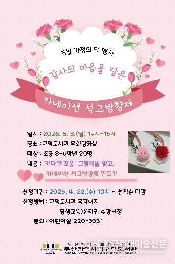 한국현대미술신문 정소영 기자 | 부산광역시립구덕도서관은 다음달 3일 도서관 문화강좌실에서 초등학교 3~6학년 20명을 대상으로 ‘감사의 마음을 담은 카네이션 석고방향제’ 체험을 운영한다.