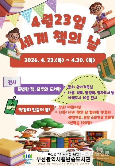 한국현대미술신문 정소영 기자 | 부산광역시립반송도서관은 세계 책의 날(4월 23일)을 맞아 오는 23일부터 30일까지 도서관 어린이실에서 유아와 초등학생을 대상으로 독서 문화 프로그램을 운영한다.