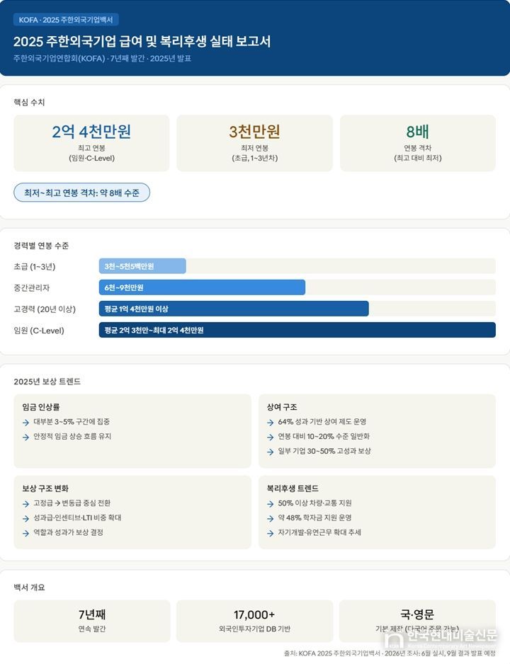 한국현대미술신문 김미정 기자 | 주한외국기업연합회(상임대표 김종철, KOFA)는 ‘2025 주한외국기업백서’ 혁신판을 발표하고, 작년 6월 실시한 주한외국기업 급여 및 상여금 실태조사와 함께 복리후생 조사 결과를 포함해 공개했다. 이번 백서는 7년째 발간되는 자료로, 기존 조사 대비 한층 고도화된 분석 체계를 적용해 글로벌 전문 조사기관 수준의 HR 리포트로 업그레이드됐다는 평가를 받고 있다.