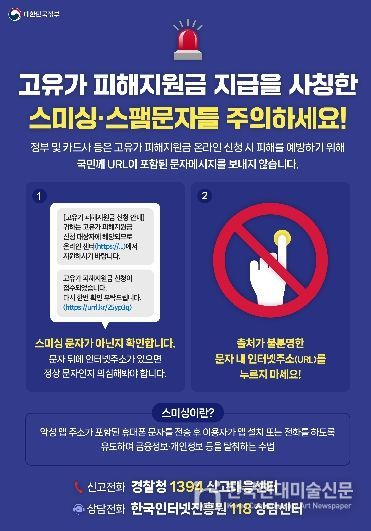 한국현대미술신문 신정은 기자 | 천안시가 20일 고유가 피해지원금 신청 시기를 맞아 지원 안내를 사칭한 스미싱(문자결제사기) 범죄에 대해 시민들의 각별한 주의를 당부했다.