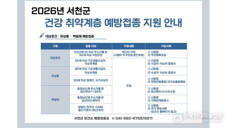 한국현대미술신문 신정은 기자 | 서천군은 고령층과 임산부 등 건강 취약계층을 대상으로 대상포진, 백일해, 파상풍 예방접종 지원사업을 추진하는 가운데 올해 백일해와 파상풍 예방접종 지원 대상을 확대한다고 밝혔다.