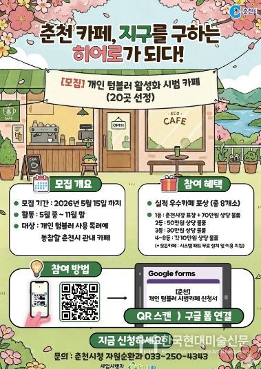 한국현대미술신문 원진 기자 | 춘천시는 일회용품 사용을 줄이고 자원순환 문화를 확산하기 위해 ‘개인 텀블러 활성화 시범 카페’를 모집한다.