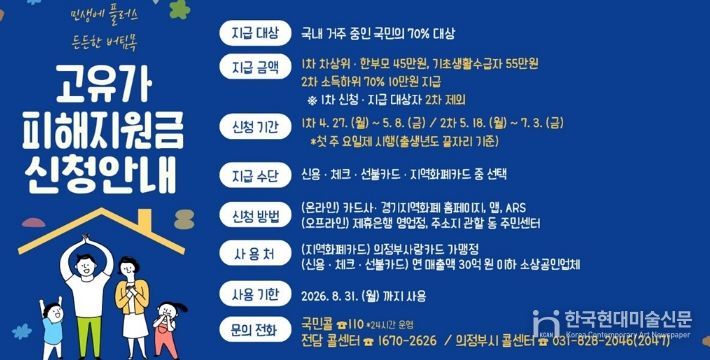 한국현대미술신문 배윤섭 기자 | 의정부시는 중동전쟁으로 촉발된 고유가‧고물가로 인한 국민 부담을 경감하고자 ‘고유가 피해지원금’ 신청을 4월 27일부터 접수한다.