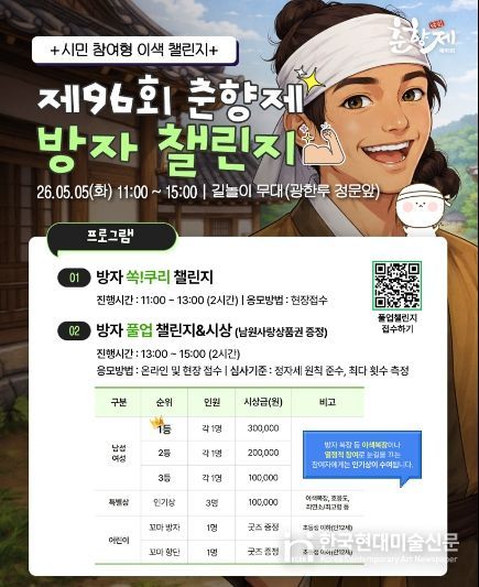 한국현대미술신문 기자 | 대한민국 대표 축제인 ‘제96회 춘향제’가 춘향전 속 방자 캐릭터의 재치와 기개를 현대적으로 재해석한 참여형 프로그램 ‘방자 챌린지’를 선보인다. 이번 프로그램은 관람객들에게 더욱 젊고 활기찬 에너지를 전달하며 축제 분위기를 한층 고조시킬 전망이다.