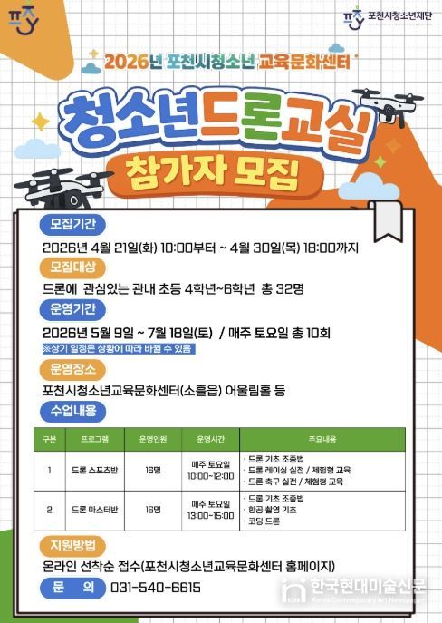 한국현대미술신문 배윤섭 기자 | (재)포천시청소년재단 포천시청소년교육문화센터는 오는 4월 21일부터 30일까지 관내 초등학교 4학년부터 6학년을 대상으로 청소년드론교실 1기 참가자를 선착순으로 모집한다고 밝혔다.