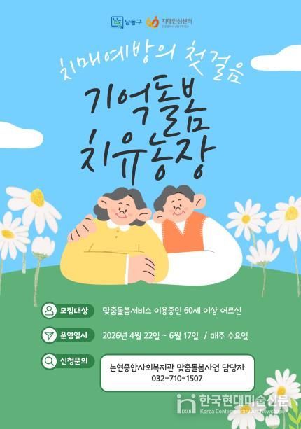 한국현대미술신문 박재남 기자 | 인천시 남동구보건소가 자연 속 농업 활동을 활용한 치매 예방 프로그램 ‘기억돌봄 치유농장’을 올해부터 정식 사업으로 확대 운영한다.