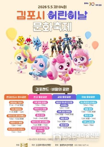 한국현대미술신문 배윤섭 기자 | 오는 5월 5일, 김포 전역이 하나의 거대한 놀이공원이 된다. 김포시는 시가 주최하고 김포시청소년재단에서 주관하는 제104회 어린이날 문화축제가 한강신도시호수공원(마산동), 한강중앙공원(장기동), 걸포중앙공원(걸포동), 마송중앙공원(통진읍)에서 동시 개최된다고 20일 밝혔다.