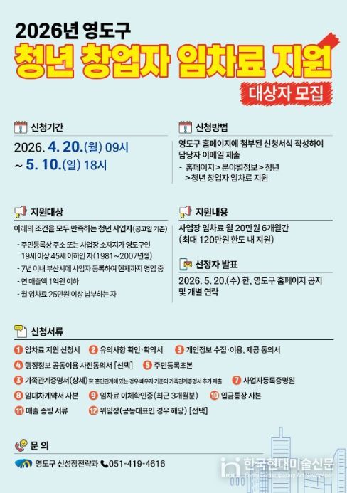 한국현대미술신문 정소영 기자 | 부산 영도구는 청년 창업가들의 경제적 부담을 덜어주고 지역 내 안정적인 사업 기반 마련을 돕기 위해 지난해에 이어 '2026년 청년 창업자 임차료 지원사업' 참여자를 모집한다고 밝혔다.