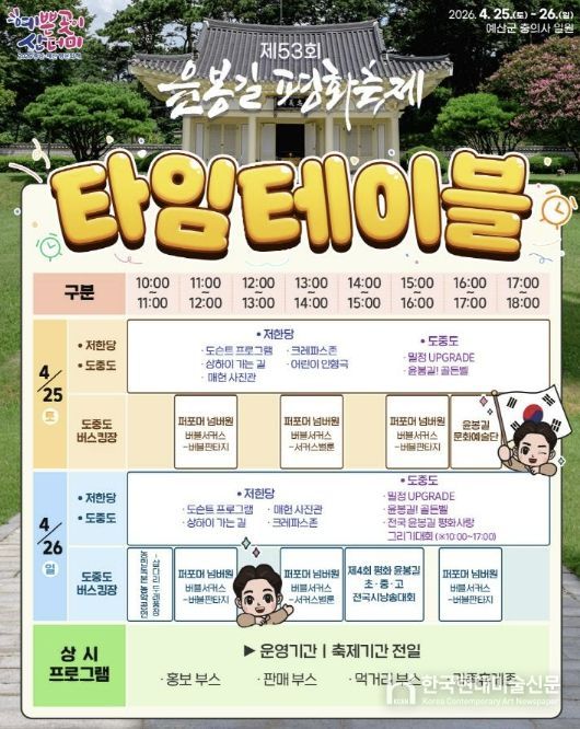한국현대미술신문 신정은 기자 | 예산군은 ‘제53회 윤봉길 평화축제’를 오는 4월 25일부터 26일까지 덕산면 충의사 일원에서 개최한다고 밝혔다.