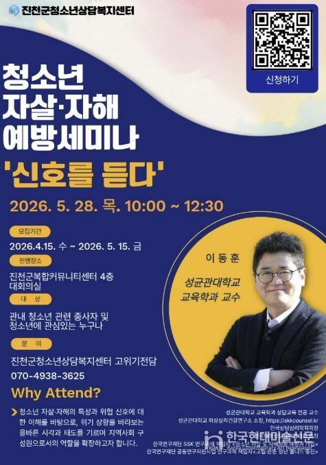 한국현대미술신문 신정은 기자 | 충북 진천군청소년상담복지센터는 오는 5월 28일 진천군복합커뮤니티센터에서 청소년 자살·자해 예방 세미나 ‘신호를 듣다’를 개최한다고 밝혔다.
