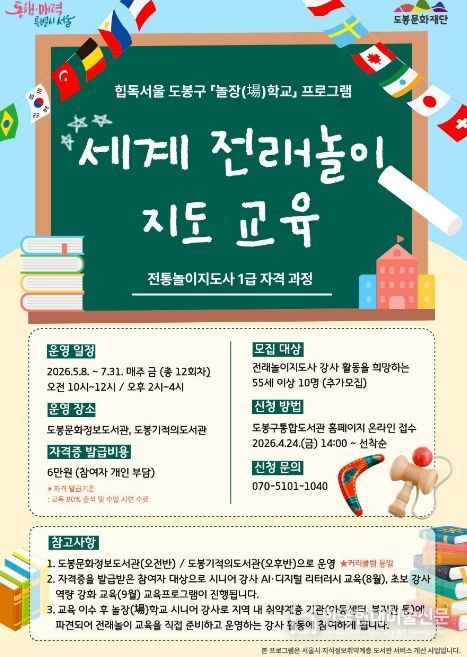 세계 전래놀이 지도 교육은 도봉문화정보도서관(오전반), 도봉기적의도서관(오후반)에서 운영되며 신청은 4월 24일 오후 2시부터 도봉구통합도서관 누리집에서 가능하다.