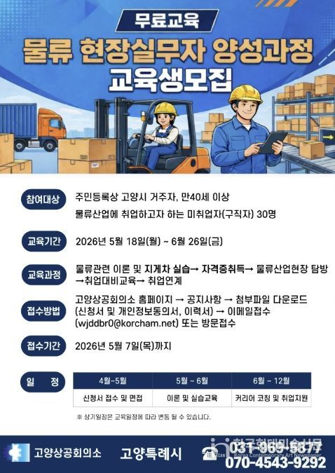 한국현대미술신문 배윤섭 기자 | 고양특례시는 2026년 고양맞춤형 일자리학교 공모에 선정된 ‘물류 현장실무자 양성과정’에 참여할 교육생을 오는 5월 7일까지 모집한다.