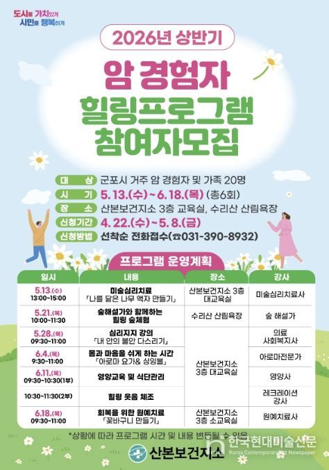 한국현대미술신문 배윤섭 기자 | 군포시 산본보건지소는 오는 5월 13일부터 6월 18일까지 총 6회에 걸쳐 암 경험자와 그 가족 20여 명을 대상으로 암 경험자 자조모임인 ‘봄·봄·봄 프로그램’을 운영한다.