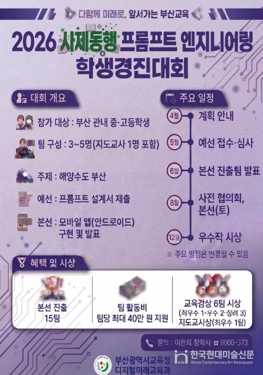 한국현대미술신문 정소영 기자 | 부산광역시교육청은 관내 중·고등학생과 교사가 한 팀으로 참여하는 ‘사제동행 2026 프롬프트 엔지니어링 학생경진대회’를 개최한다고 밝혔다.