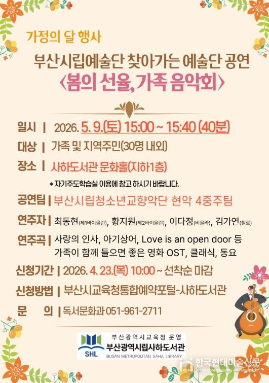 한국현대미술신문 정소영 기자 | 부산광역시립사하도서관은 가정의 달을 맞아 다음달 9일 오후 3시 도서관 문화홀에서 지역주민 30명을 대상으로 부산시립예술단 찾아가는 예술단 공연 ‘봄의 선율, 가족 음악회’를 개최한다.