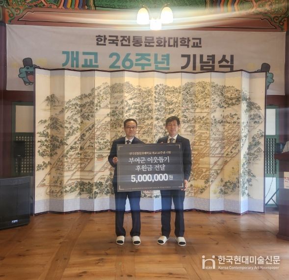 한국현대미술신문 신정은 기자 | 한국전통문화대학교 교직원일동은 개교 26주년 기념행사에서 저소득 가구의 초·중·고 학생 장학금으로 사용해 달라며 이웃돕기 성금 500만 원을 부여군에 기탁했다고 22일 밝혔다.