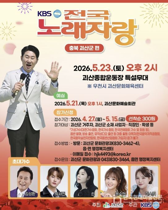 한국현대미술신문 신정은 기자 | 충북 괴산군은 군민 화합과 지역 홍보를 위해 ‘KBS 전국노래자랑 괴산군편’ 녹화를 오는 5월 23일 괴산종합운동장 특설무대에서 진행한다고 22일 밝혔다.