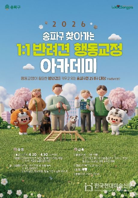 한국현대미술신문 배건 기자 | 서울 송파구는 5월부터 11월까지 ‘찾아가는 반려견 행동교정 아카데미’를 운영한다고 22일 밝혔다.