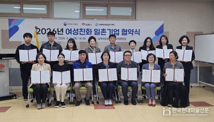 한국현대미술신문 기자 | 김제시여성새로일하기센터는 지난 21일 새일센터 직업훈련실에서여성 취업자의 고용 유지 지원 등을 위한 지역 업체와의 협력망 구축을 위해'2026년 여성친화 일촌기업 협약식'을 개최했다고 밝혔다.