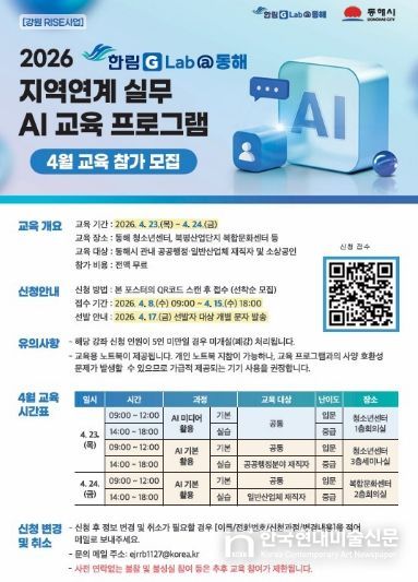 한국현대미술신문 원진 기자 | 동해시와 한림대학교(총장 최양희)는 동해시 청소년센터와 북평산업단지 복합문화센터에서 공공행정 및 지역 산업체 종사자를 대상으로 직무 특성에 맞춘'한림 G-Lab@동해 지역 연계 실무형 AI 교육 프로그램'을 운영한다고 밝혔다.