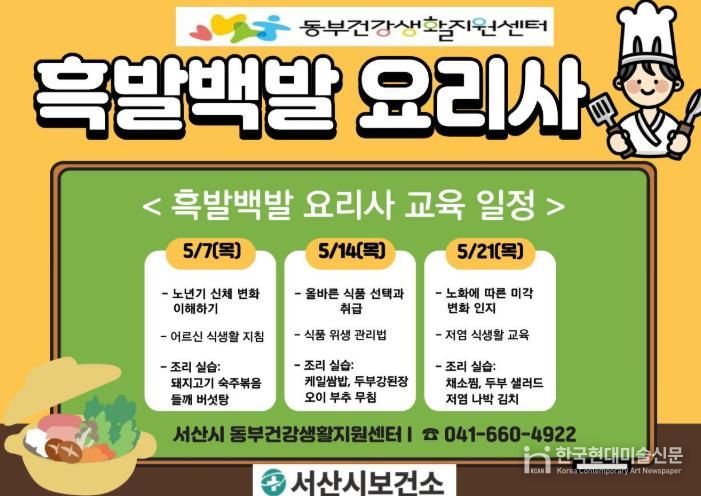 한국현대미술신문 신정은 기자 | 서산시 보건소 동부건강생활지원센터에서 60세 이상 남성어르신을 대상으로 건강한 식생활 실천과 자가 건강관리 능력 향상을 위해 '흑발백발 요리사' 프로그램 대상자를 모집한다고 밝혔다.