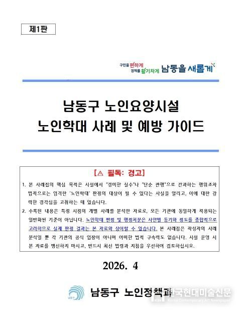 한국현대미술신문 박재남 기자 | 인천시 남동구가 사후 처분 중심의 행정에서 벗어나 현장의 혼란을 선제적으로 해결하는 적극행정의 일환으로 인천시 최초로 ‘남동구 노인요양시설 노인학대 사례 및 예방가이드’를 발간한다고 22일 밝혔다.