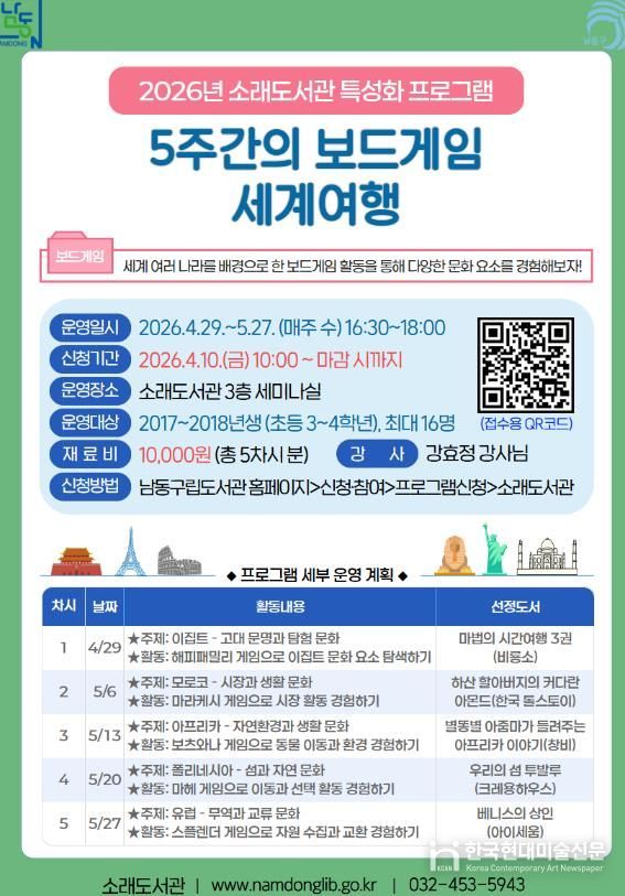한국현대미술신문 박재남 기자 | 인천시 남동남동구립도서관은 지역주민들에게 다채로운 독서문화 체험의 장을 제공하기 위해 ‘2026년 특성화 프로그램’을 운영한다고 22일 밝혔다.