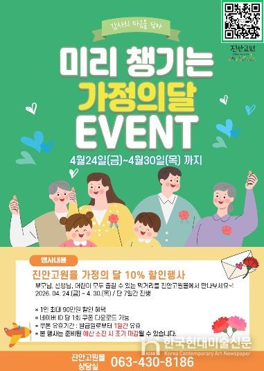 한국현대미술신문 기자 | 진안군은 5월 가정의 달을 앞두고 감사의 마음을 전하려는 소비자들을 위해 공식 온라인 쇼핑몰인 ‘진안고원몰’에서 전 품목 10% 할인 행사를 진행한다.