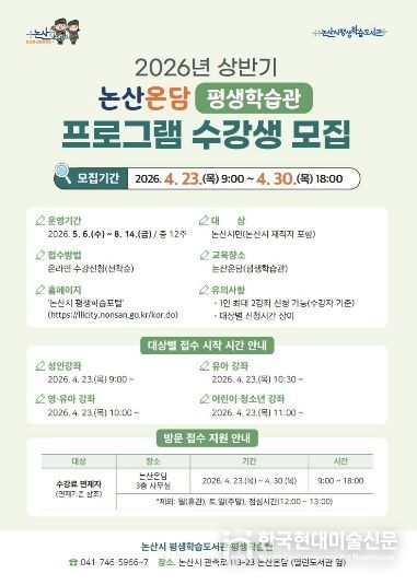 한국현대미술신문 신정은 기자 | 논산시가 4월 23일부터 4월 30일까지 ‘2026년 논산시평생학습도서관 상반기 정규 프로그램’수강생을 모집한다.