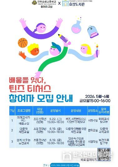 한국현대미술신문 박재남 기자 | 인천광역시 계양구립 효성도서관은 효성고등학교와 협력해 초등학생 대상 재능기부 체험형 교육 프로그램을 운영한다.