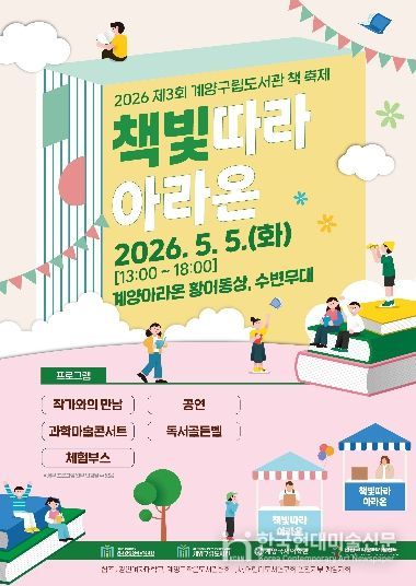 한국현대미술신문 박재남 기자 | (재)인천광역시계양구인재양성장학교육재단 계양구립도서관은 어린이날인 5월 5일 오후 1시부터 6시까지 계양아라온 황어동상 및 수변무대 일원에서 ‘제3회 계양구립도서관 책 축제 '책빛따라 아라온'’을 개최한다고 밝혔다.
