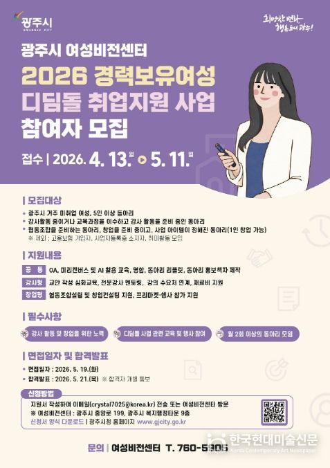 한국현대미술신문 배윤섭 기자 | 광주시는 지역 내 경력보유여성의 사회 재진출과 취업 역량 강화를 위해 ‘2026 경력보유여성 디딤돌 취업 지원 사업’ 참여자를 오는 5월 11일까지 모집한다고 22일 밝혔다.