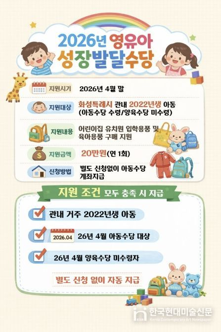 한국현대미술신문 배윤섭 기자 | 화성특례시는 어린이집 및 유치원 입학 초기 영유아 가정의 양육 부담을 덜고 아동의 건강한 성장을 지원하기 위해 ‘2026년 영유아 성장발달수당’을 지급한다고 밝혔다.