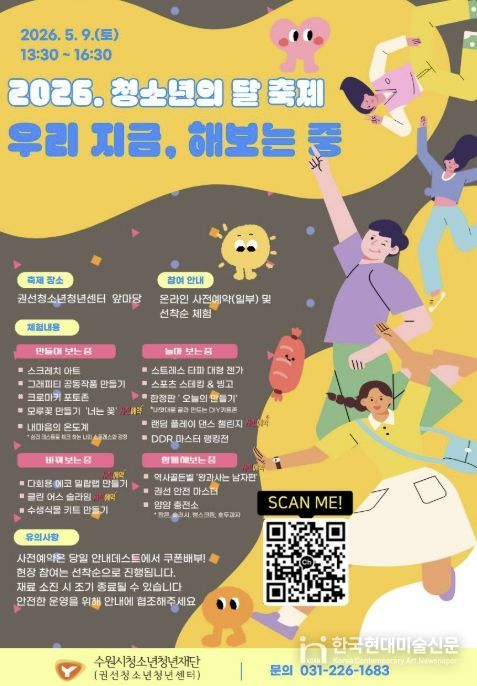 한국현대미술신문 배윤섭 기자 | 수원시청소년청년재단 권선청소년청년센터가 오는 5월 9일, 청소년이 주인공이 되어 직접 경험하고 도전하는 참여형 축제 ‘지금우리, 해보는중’을 개최한다고 밝혔다.