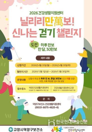 한국현대미술신문 배윤섭 기자 | 고양특례시 덕양구보건소 건강생활지원센터는 지역주민의 건강생활 실천 확산을 위한 생활밀착형 걷기 프로그램 ‘2026 닐리리만보 걷기 챌린지’를 오는 5월부터 운영을 시작한다.