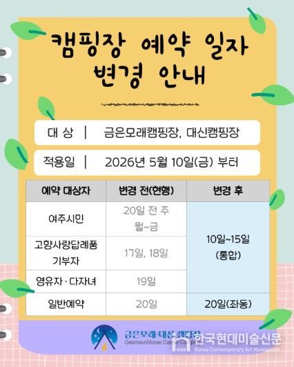 한국현대미술신문 배윤섭 기자 | 여주도시공사는 오는 5월 10일부터 이용자 중심의 고품질 서비스 제공을 위해 금은모래캠핑장, 대신캠핑장의 온라인 통합예약 일정을 대폭 간소화한다고 밝혔다.