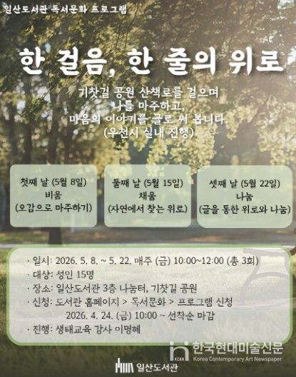 한국현대미술신문 배윤섭 기자 | 고양특례시는 오는 5월 8일부터 22일까지 매주 금요일 일산도서관 3층 나눔터와 기찻길 공원 일대에서 독서문화 프로그램 ‘한 걸음, 한 줄의 위로’를 진행한다.