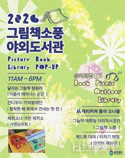 한국현대미술신문 신정은 기자 | 충북도가 4월 25일부터 26일까지 이틀간 도청 문화광장 815에서 온 가족이 함께 즐기는 ‘충북야외도서관 '그림책 소풍'’ 행사를 개최한다.